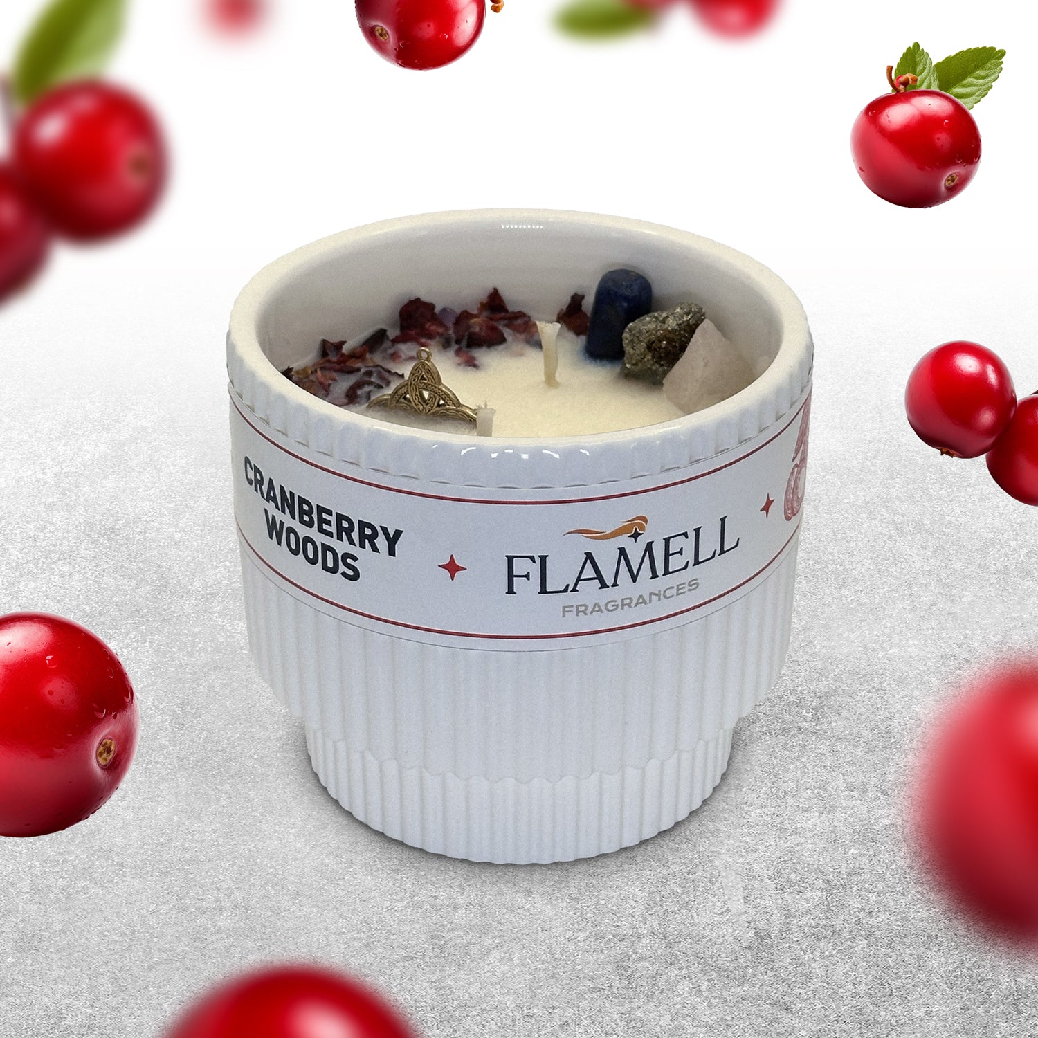 En aroma Cranberry Woods, donde la frescura del arándano y la dulzura de la fresa se combinan con la calidez de la madera de pino y cedro. Las notas de mora azul aportan un toque dulce, mientras que un suave toque de pachuli le da profundidad, evocando la tranquilidad de un bosque acogedor.