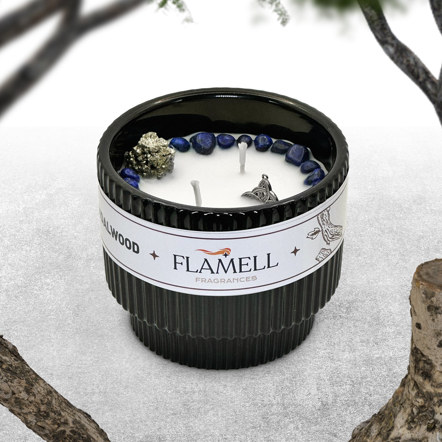 En aroma Sandalwood, la calidez de la madera de sándalo se entrelaza con las notas profundas y envolventes del ámbar, el carácter terroso del cuero y un delicado toque floral. Este aroma evoca una sensación de elegancia y serenidad, como un refugio cálido en medio de la naturaleza.